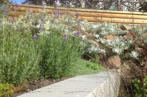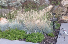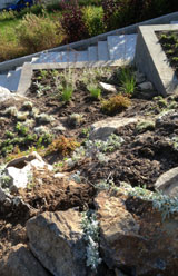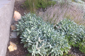 Det är full sol på planteringsytorna så växter valdes som tål torka. Det vi ser är Lammöron.